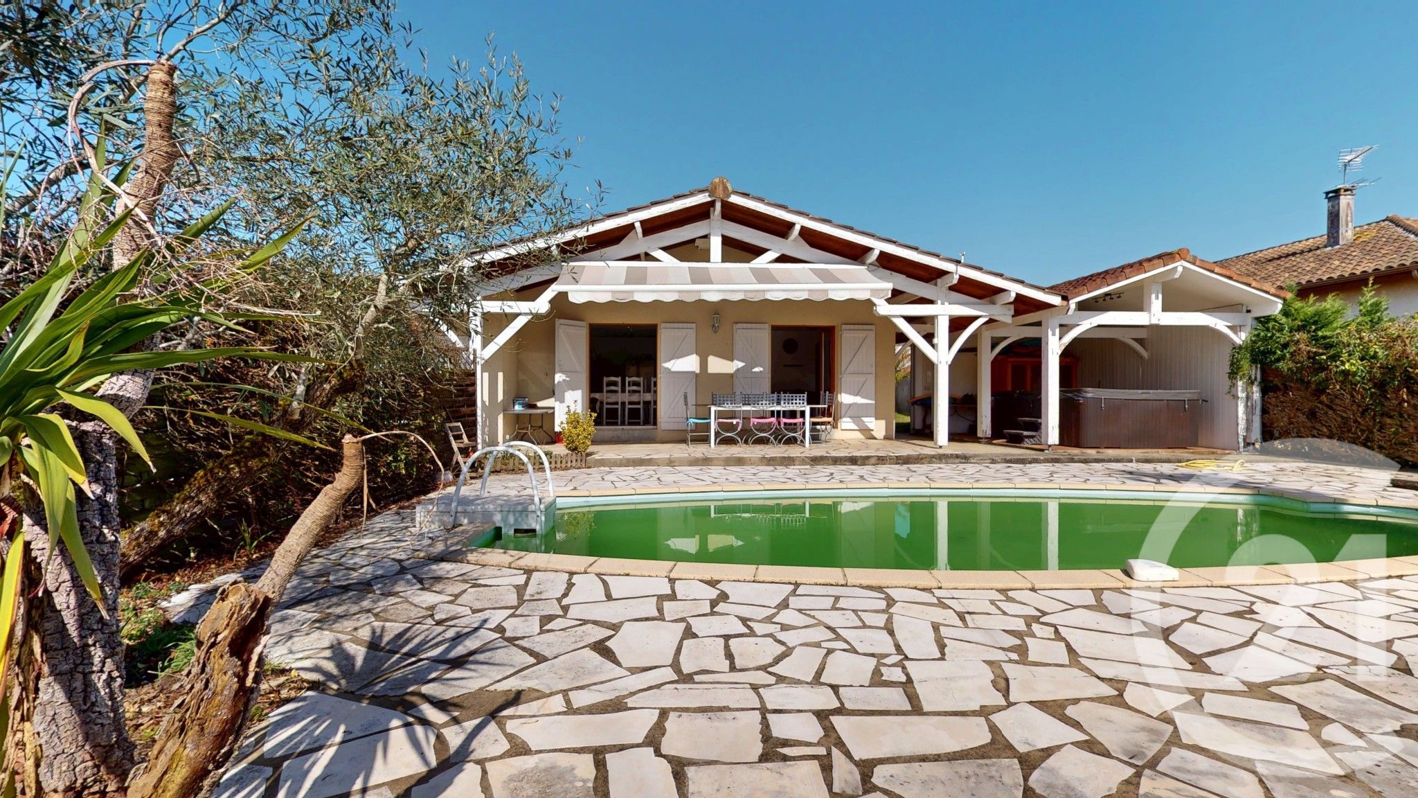 À l'extérieur, vous profiterez d'un cadre propice à la détente avec une piscine et une grande terrasse exposée plein sud. Un carport abrite un jacuzzi et un sauna. Un cabanon est également situé sur le côté du terrain.